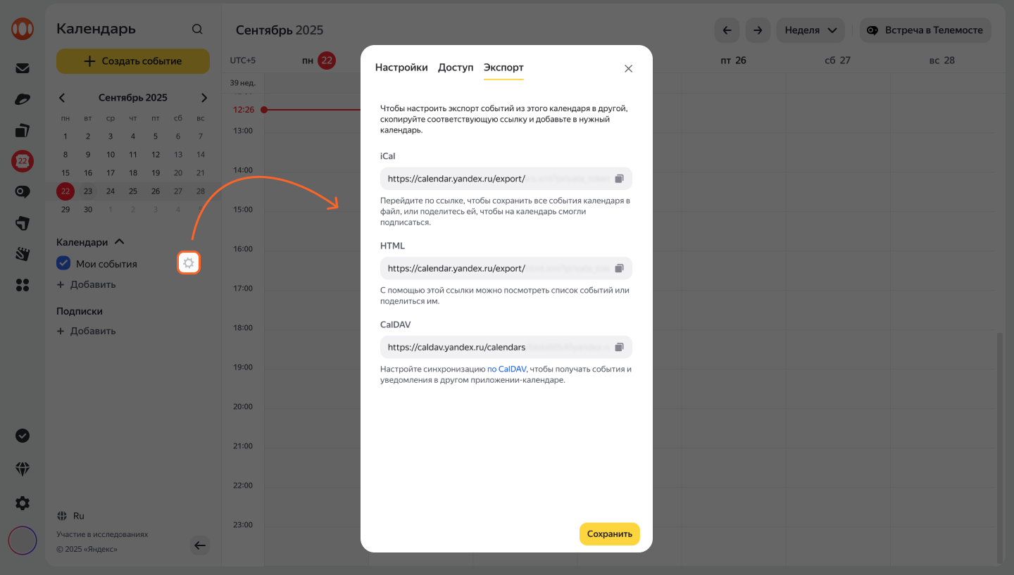 Для экспорта используются форматы iCal, HTML и протокол CalDAV. Cсылки в форматах iCal и HTML доступны для экспорта только владельцу календаря, для остальных пользователей доступна только ссылка для CalDAV.