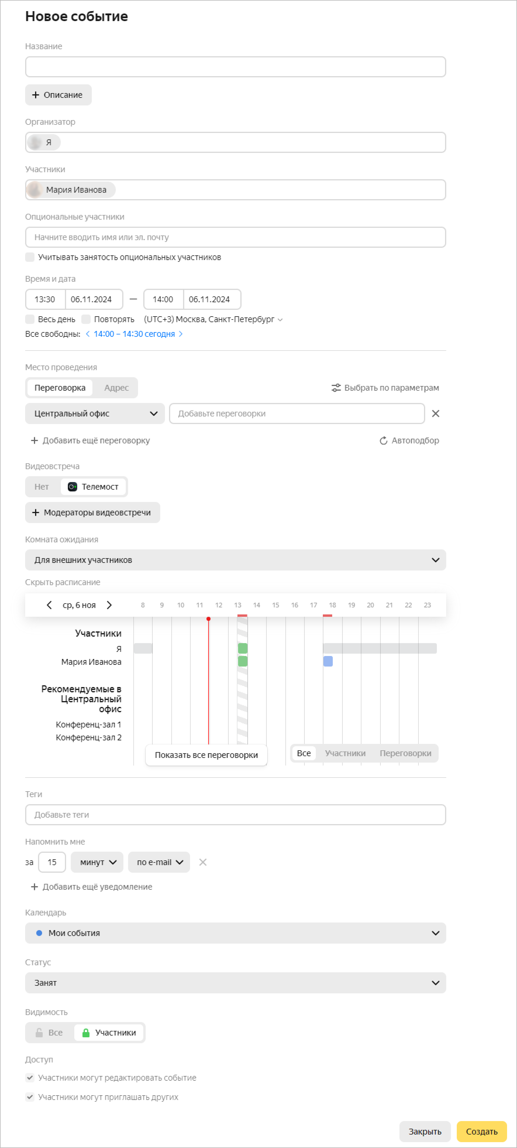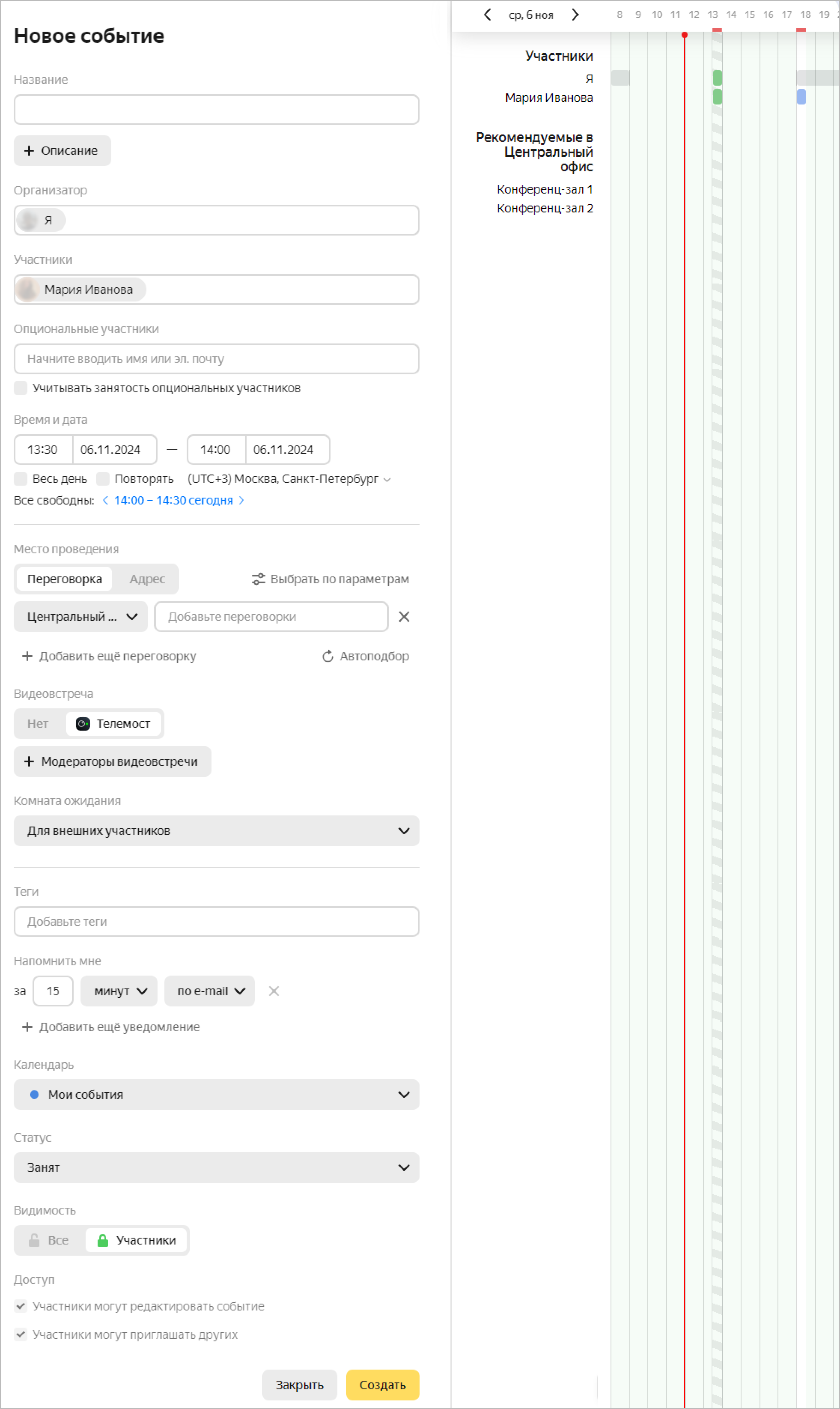 Majlis ishtirokchilarini kiriting. Agar bu vaqtda taklif qilingan band bo‘lsa, uning manzili qizil rangda belgilanadi. Shuningdek, bandlikni Ishtirokchilar bandligi ruknida kuzatishingiz mumkin.
