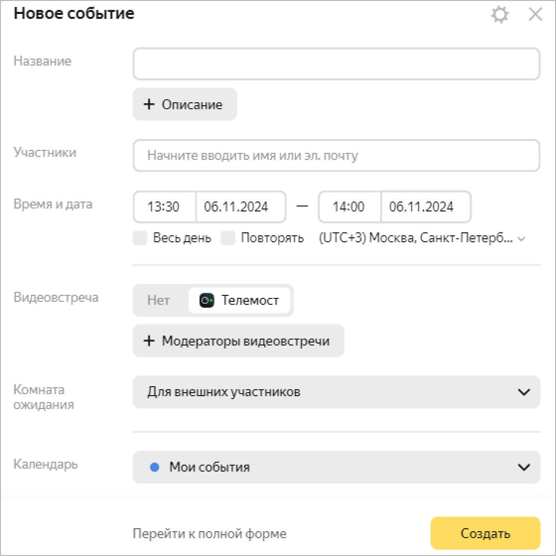 Agar muzokara xonasini tanlash, bildirishnoma vaqti va usulini belgilash yoki tadbirning ko‘rinishi va kirish huquqini sozlashni xohlasangiz, To‘liq shaklga o‘tish tugmasini bosing.