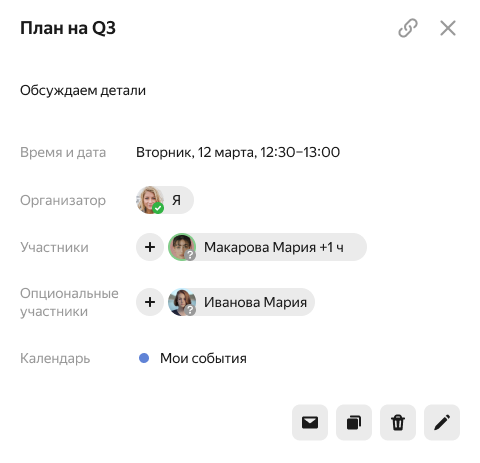 Agar shu vaqtda ishtirokchida boshqa tadbir rejalashtirilgan va u Yandex Taqvimdan foydalanayotgan bo‘lsa, uning ismi qizil yoki sariq rang bilan ajratiladi. Taklif qilingan kishi tadbirda ishtirok etishi uchun tadbirni hamma ishtirok etishi mumkin bo‘lgan vaqtga ko‘chiring.