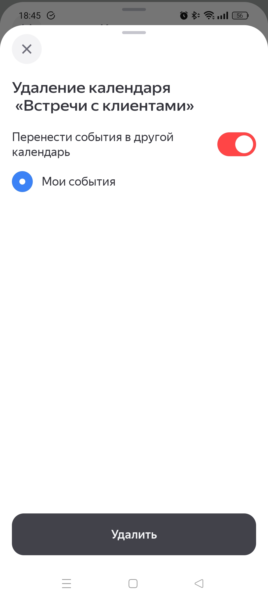 Standart holatda Yandex Taqvim o‘chirilayotgan taqvimdagi tadbirlarni asosiy taqvimingizga o‘tkazadi.