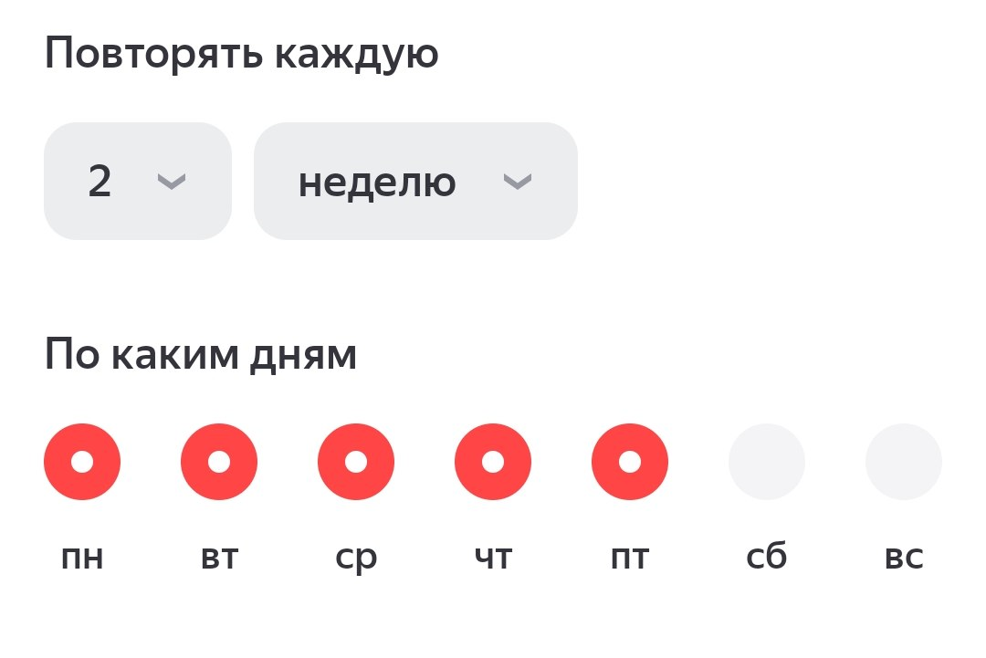 Eng oddiy takrorlash jadvallari — masalan, ish kunlari yoki haftada bir marta — ilovada allaqachon sozlangan, faqat keraklisini tanlash kifoya.