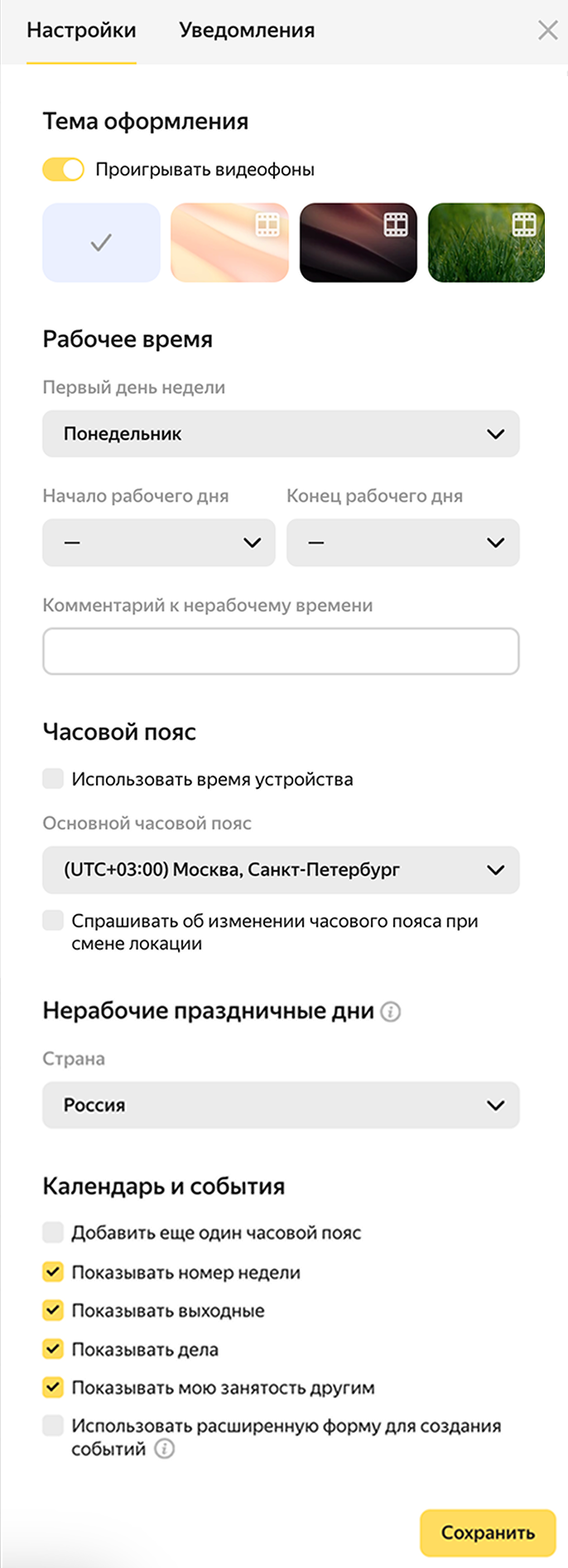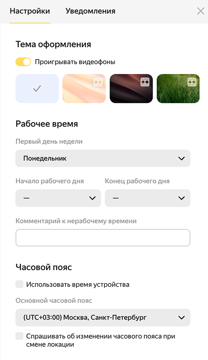Sozlamalar sahifasida rangli bezak mavzusini tanlashingiz mumkin — u Taqvimda ham, Pochta, Disk, Telemost va Hujjatlarda ham ko‘rsatiladi. Rasm animatsiyali chiqishi uchun Videofonlarni ijro etish parametrini yoqing.