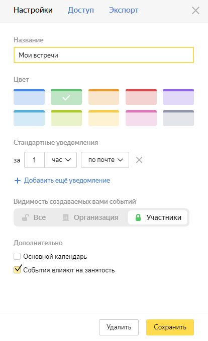 Agar majlislarni tez-tez yaratayotgan bo‘lsangiz, taqvimni shunday sozlangki, barcha yangi tadbirlar muayyan sozlamalar bilan yaratilsin. Odatiy holatda taklif qilinganlarga tadbirlarni tahrirlashga ruxsat berish mumkin — masalan, ular o‘zlari muzokara xonalarini qo‘shishi mumkin. Agar uchrashuvlar uchun Yandex Telemostdan foydalansangiz, video majlislarga avtomatik havolalar yaratishni yoqing va majlislaringizda tashqi ishtirokchilar (masalan, boshqa kompaniyalardan maslahatchilar yoki hamkorlar) qatnashishi mumkinligini ko‘rsating.