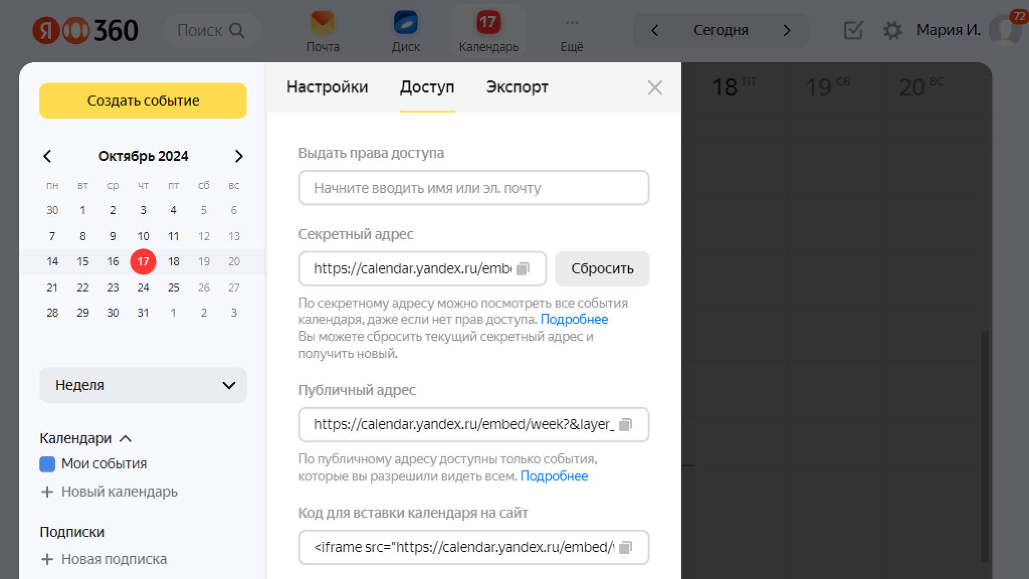 Yandex Taqvimdagi tadbirlarni boshqa saytdagi taqvimga ko‘chirishingiz yoki taqvimingizdagi tadbirlarni boshqalarga fayl yoki havola yuborish orqali ulashishingiz mumkin.