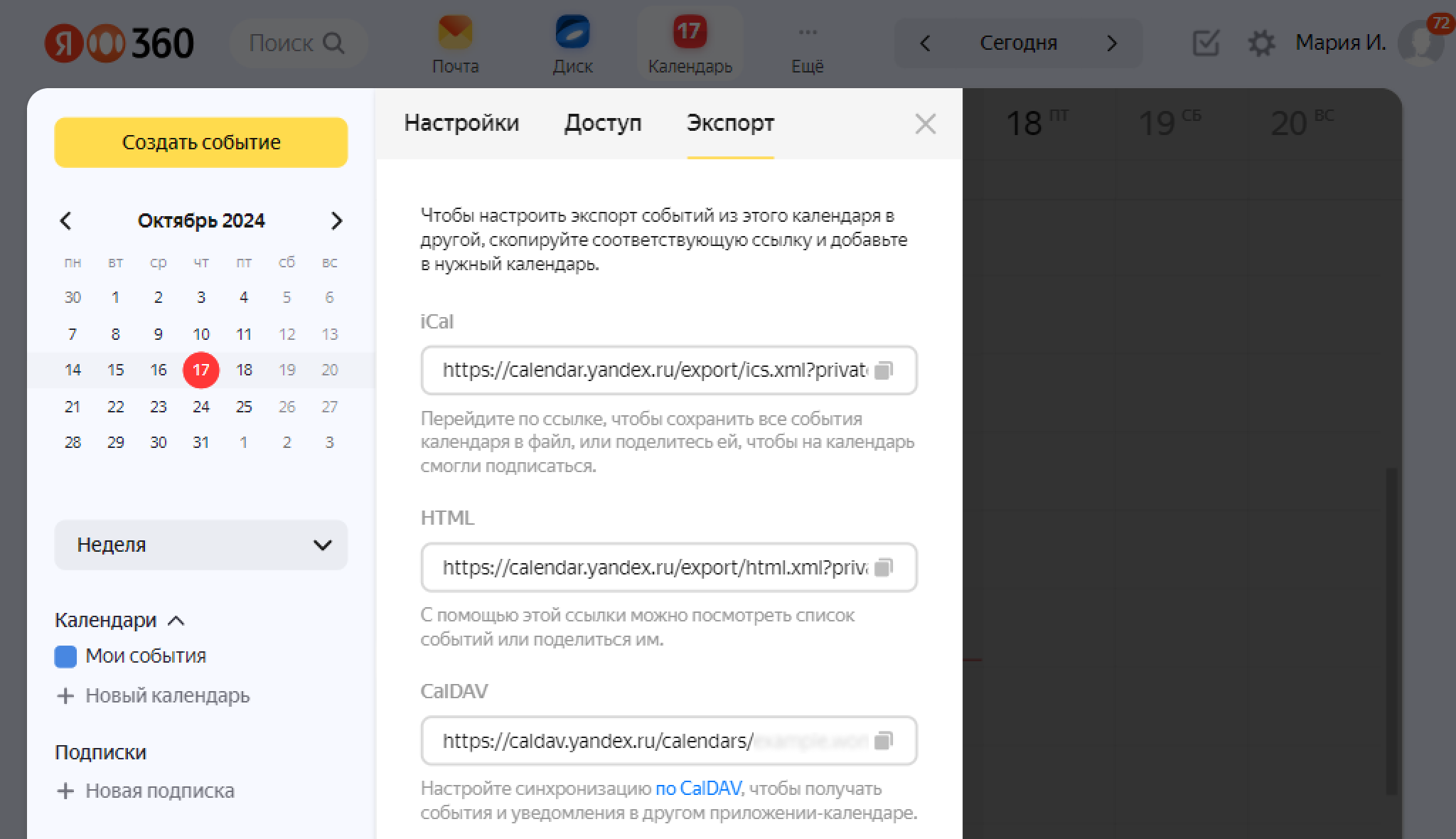 Eksport uchun iCal, HTML formatlari va CalDAV protokoli ishlatiladi. iCal va HTML formatidagi havolalardan faqat taqvim egasi eksport qilish uchun foydalana oladi, qolgan foydalanuvchilar uchun faqat CalDAV havolasi mavjud.