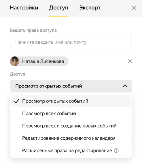 Hamkasblar bilan birga ulashishni sozlashingiz va taqvimdan foydalanishingiz mumkin. Ruxsat olgach, ular taqvimingizni o‘zining Yandex Taqvimida ko‘radi. Bu taqvimga kiritgan o‘zgarishlaringiz (masalan, tadbirni yaratish yoki o‘chirish) unga kirish ruxsatiga ega barcha xodimlarga ko‘rinadi.