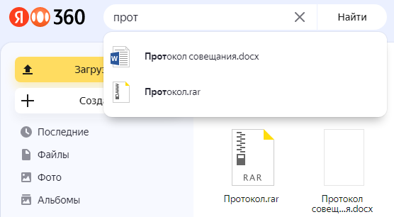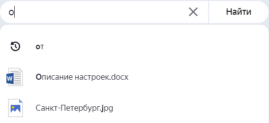Agar faylning nomini to‘liq eslay olmasangiz, uni kiritishni boshlang — Disk sizga mos variantlarni ko‘rsatadi. Shuningdek, Disk tavsiyalarida avvalgi so‘rovlaringiz ham chiqadi.