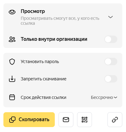 - Fayl yoki jildni yuklab olishni taqiqlang (Ruxsat darajasi Ko‘rish bo‘lsa) — bunday havola orqali o‘tgandan so‘ng Yuklab olish, Yandex Diskga saqlash va Chop etish tugmalari boshqalar uchun mavjud bo‘lmaydi. Hujjatni faqat ochiq sahifadan ko‘rish mumkin bo‘ladi.