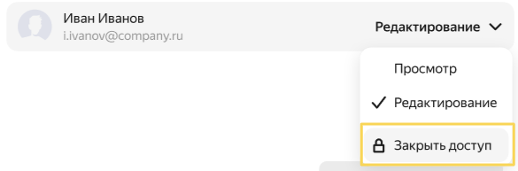 Fayl yoki jildga barcha xodimlar yoki tashqi foydalanuvchilar uchun ulashishni sozlash mumkin. Masalan, hujjatni kompaniya mijozi yoki Yandex’da pochtasi bo‘lmagan xodim bilan bo‘lishish uchun. Ulashuvni sozlash orqali fayl yoki jildni himoyalashingiz mumkin: