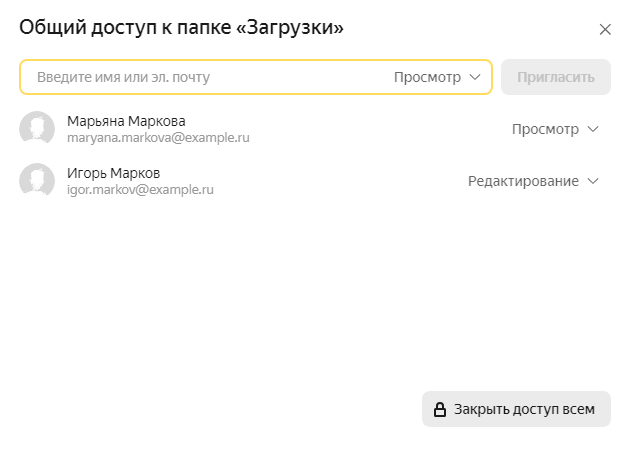 Bunday holda, ishtirokchi xizmat sahifasida ham, dasturlar yoki ilovalar yordamida ham fayllarni o‘zgartira olmaydi yoki qo‘sha olmaydi. (“Yandex Disk” dasturi cheklangan foydalanuvchining o‘z kompyuteridagi umumiy jildda amalga oshirgan o‘zgarishlarini sinxronlamaydi.)