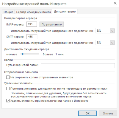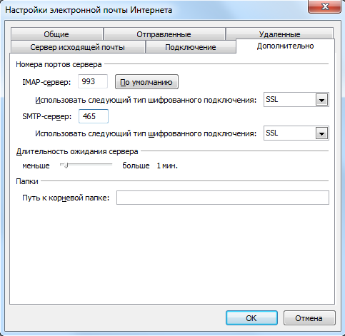 Перейдите на вкладку Дополнительно. Выберите в пункте Использовать следующий тип шифрованного подключения значение SSL для IMAP- и SMTP-сервера. Укажите следующие параметры: