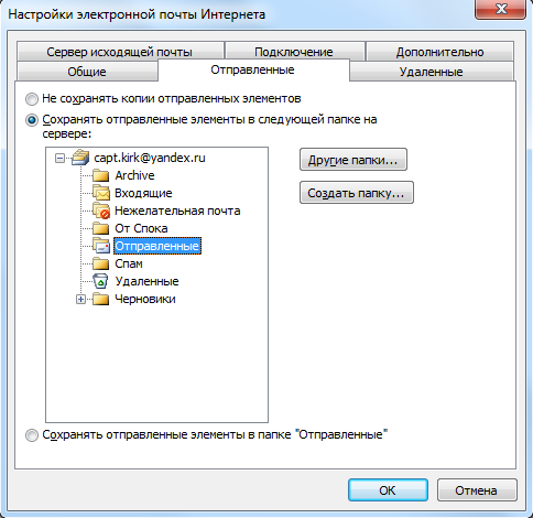 - Установите значение Сохранять отправленные элементы в следующей папке на сервере и укажите папку Отправленные.