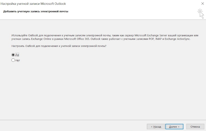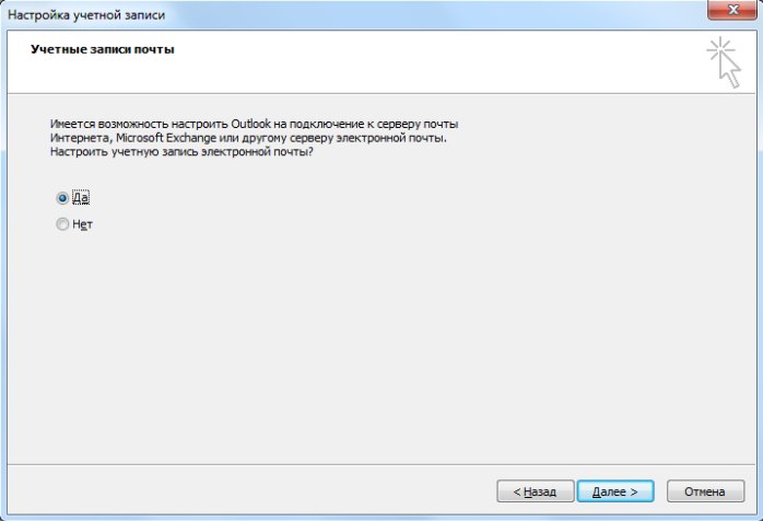 В окне Настройка учетной записи оставьте значение Да по умолчанию и нажмите Далее.