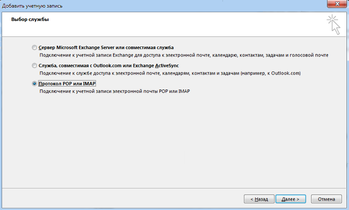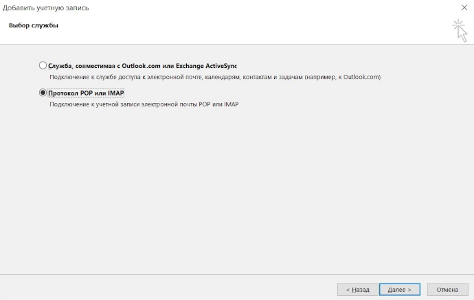 Выберите значение Протокол POP или IMAP и нажмите Далее.