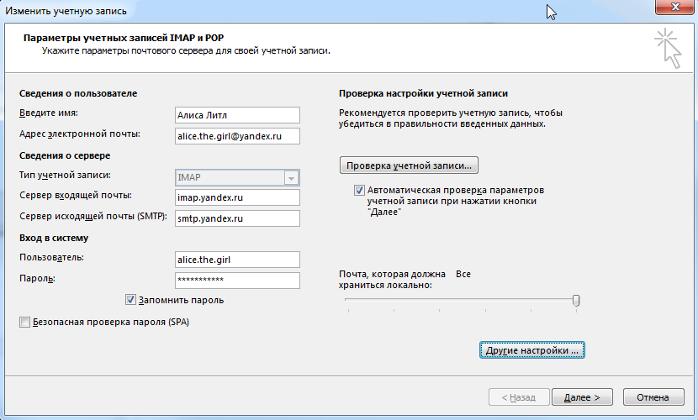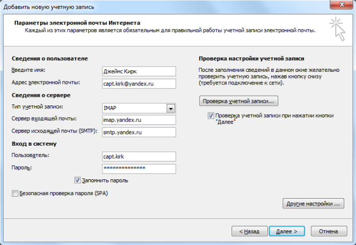 Оставьте другие параметры по умолчанию и нажмите Далее — будет выполнена проверка настроек учетной записи. Если проверка завершилась удачно, нажмите кнопку Готово. Если нет, убедитесь, что все параметры указаны корректно.