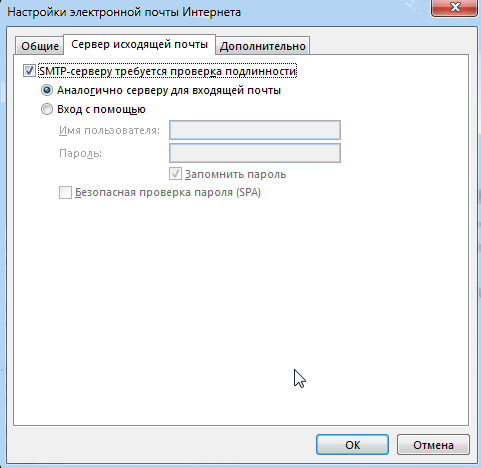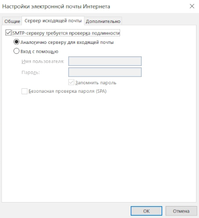 Перейдите на вкладку Сервер исходящей почты, включите опцию SMTP-серверу требуется проверка подлинности и выберите значение Аналогично серверу для входящей почты.