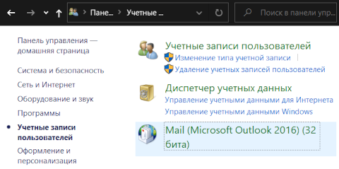Откройте Панель управления вашего устройства и перейдите в Учетные записи пользователей. Откройте Mail (Microsoft Outlook 2016).