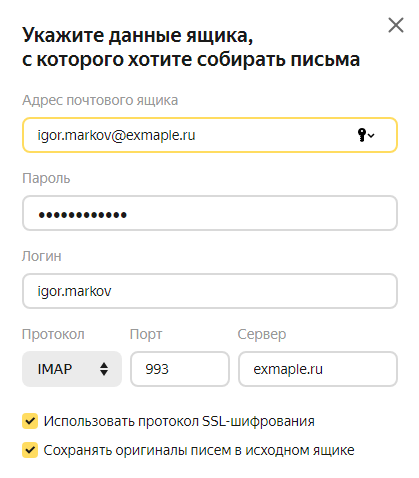 Если вы хотите собирать письма с почтового ящика на Яндексе в ящик другого сервиса, включите доступ к почтовому ящику с помощью почтовых клиентов С сервера imap.yandex.ru по протоколу IMAP (подробнее здесь).
