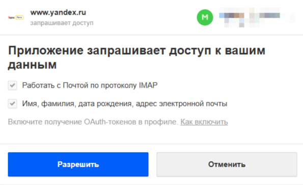 Разрешите Яндексу доступ к вашему ящику. Доступ будет использоваться только для работы с почтой.