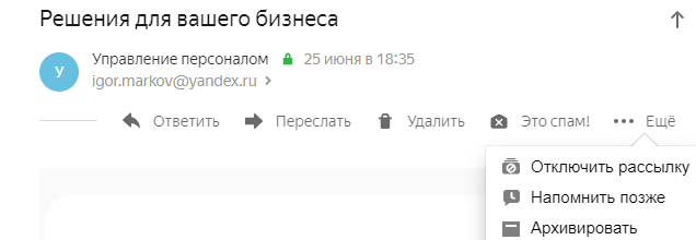 После того как вы нажмете кнопку, выбранное письмо попадет в папку Удаленные. Данная рассылка больше не будет приходить в ваш почтовый ящик.