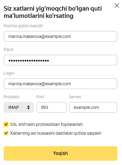 Agar Yandex pochta qutisidagi xatlarni boshqa xizmat qutisiga jamlamoqchi boʻlsangiz, Serverdan imap.yandex.ru IMAP protokoli orqali (batafsil bu yerda) pochta klientlari yordamida pochta qutisiga kirishni yoqing.