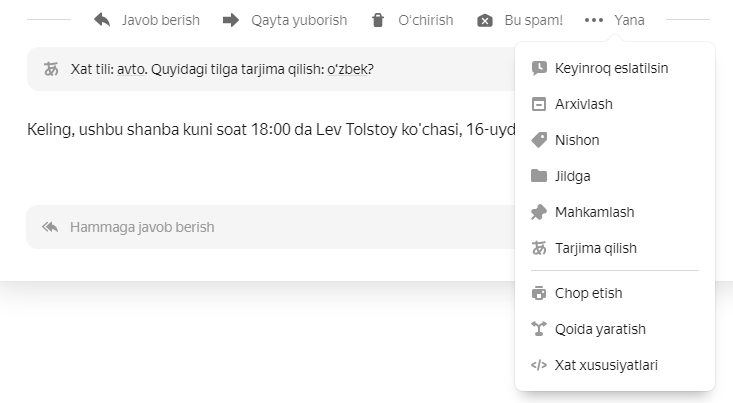 Suhbat zanjirida siz suhbatdagi barcha xatlarni bir vaqtda boshqarishingiz — masalan, barchasini ochilgan deb belgilashingiz, o‘chirishingiz yoki qayta uzatishingiz mumkin. Buning uchun xat menyusida