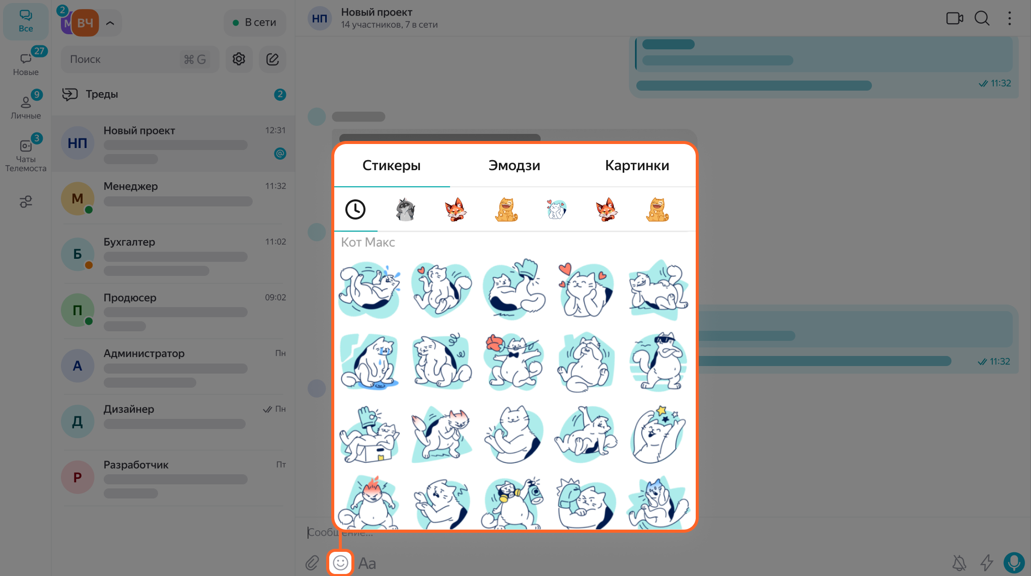 В Мессенджере можно выразить эмоции или оживить переписку с помощью реакций, стикеров, эмодзи и картинок. Реакции крепятся к уже отправленным сообщениям. Стикеры, эмодзи и картинки можно отправлять как отдельные сообщения.