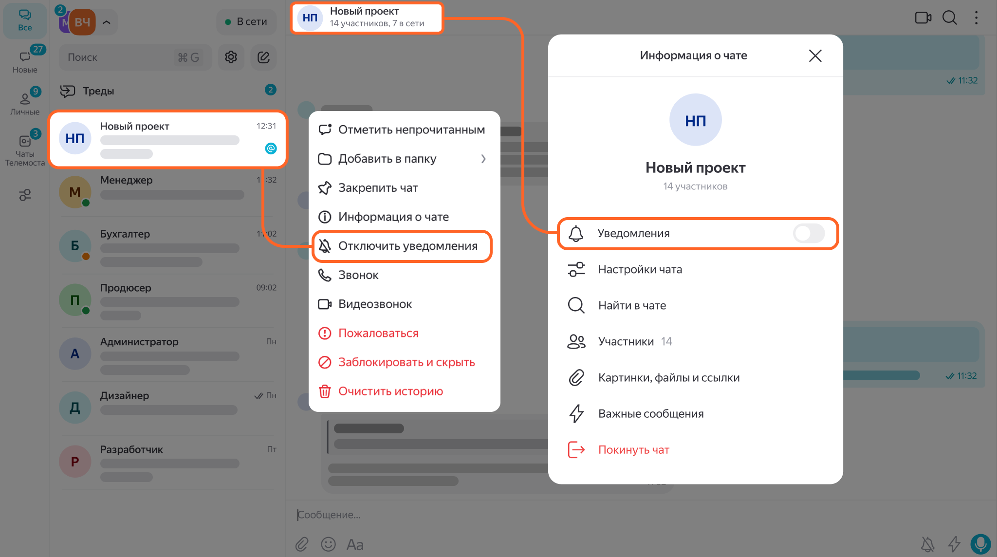 Чтобы уведомления из чата или канала не отвлекали, заглушите их. Для этого нажмите на три точки в правом верхнем углу чата → Отключить уведомления.