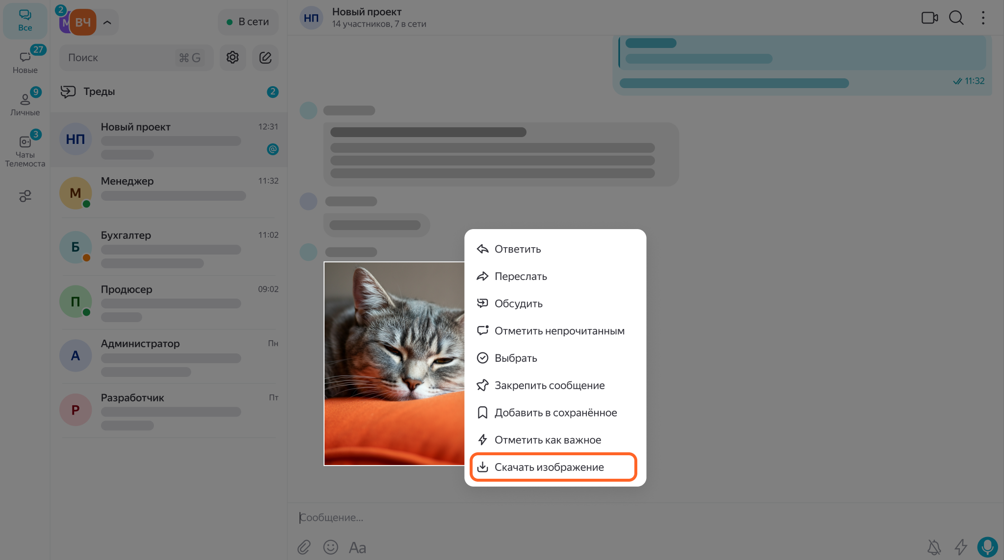 Чтобы сохранить файл или изображение из чата с коллегами, в сообщении с ним нажмите Скачать. Если нужно сохранить изображение, нажмите на сообщение с ним и выберите Скачать изображение.
