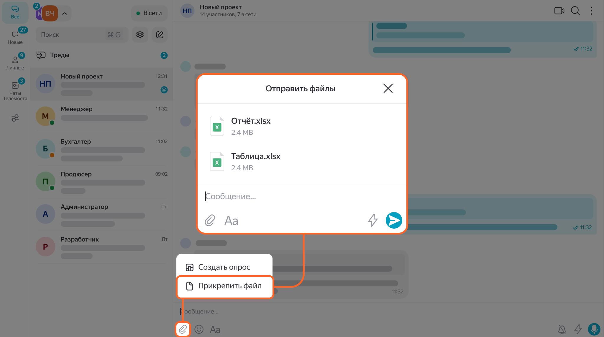 Вы можете делиться в чатах с коллегами файлами — изображениями, видео, архивами, документами и любыми другими. Единственное ограничение: разом можно отправить не больше 50 ГБ.