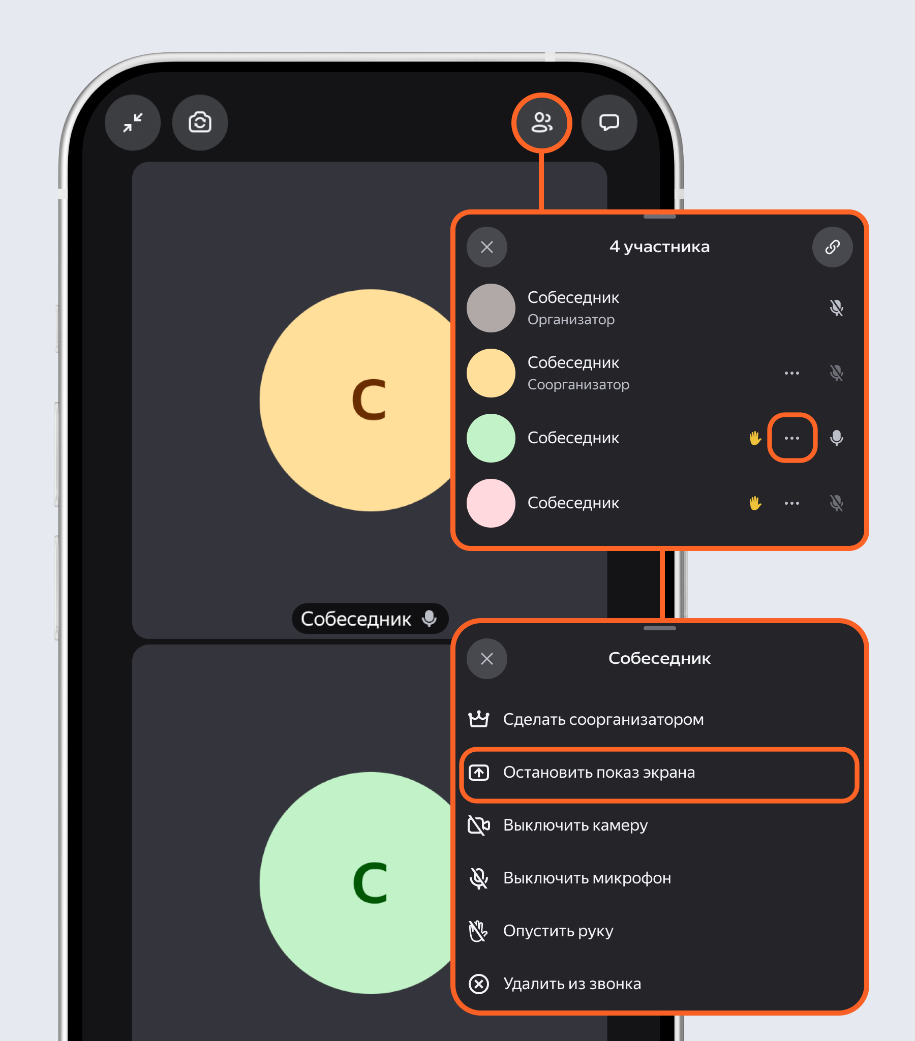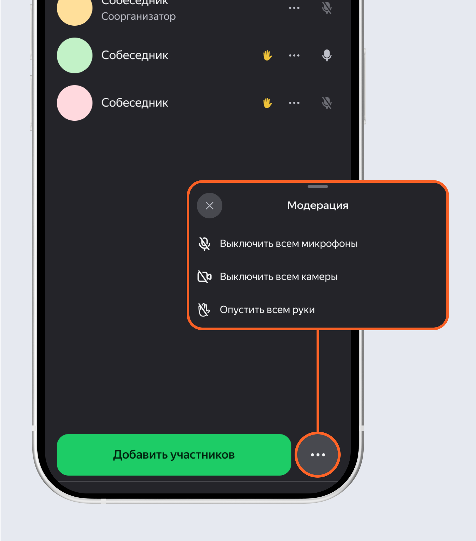 Tashkilotchi va hamtashkilotchi suhbatdoshni chaqiruvdan olib tashlashi mumkin.
