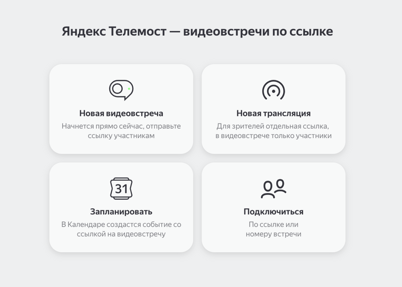 На главной странице Телемоста можно начать или запланировать встречу, подключиться ко встрече или трансляции.