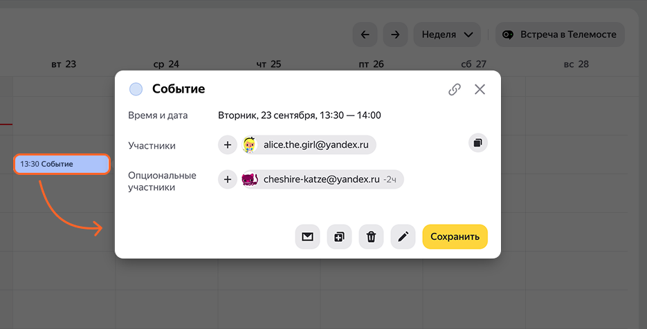 Добавить участника проще всего прямо из карточки события — она откроется, если вы нажмете на событие в сетке календаря: