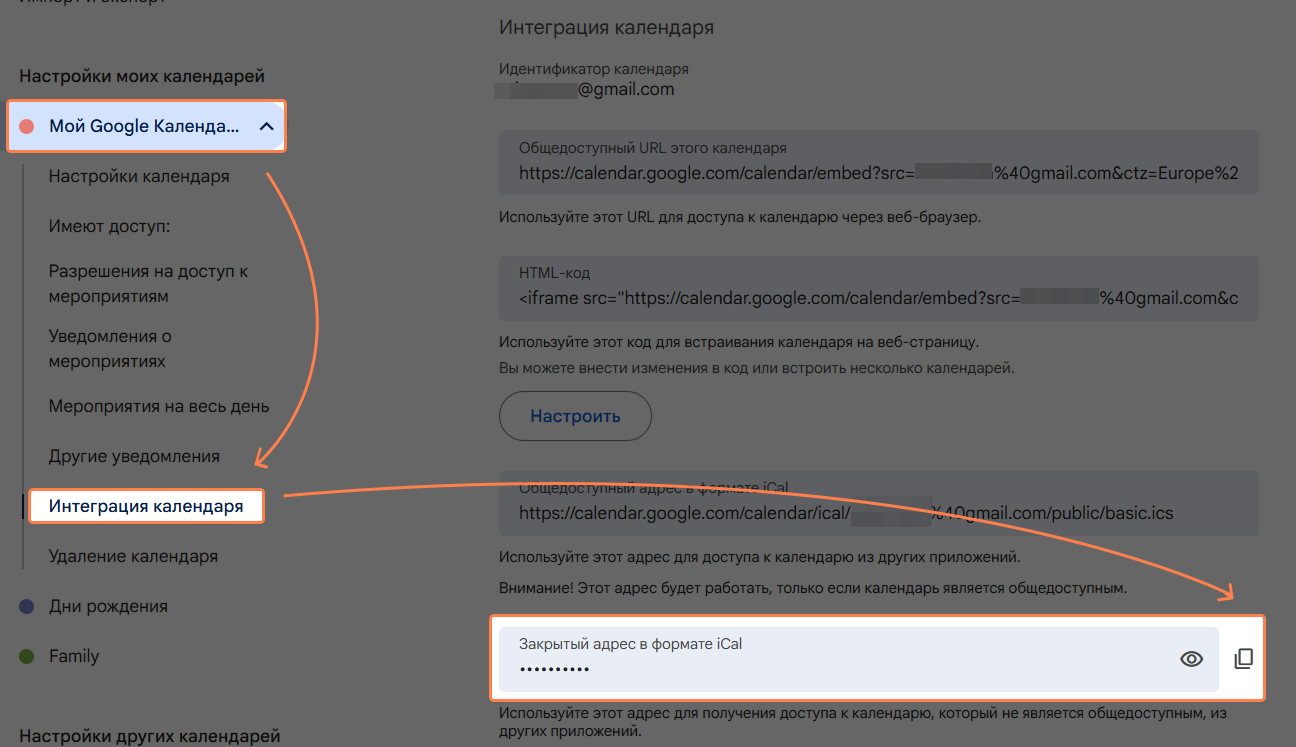 - Зайдите в настройки календаря нужного сервиса и скопируйте адрес календаря в формате