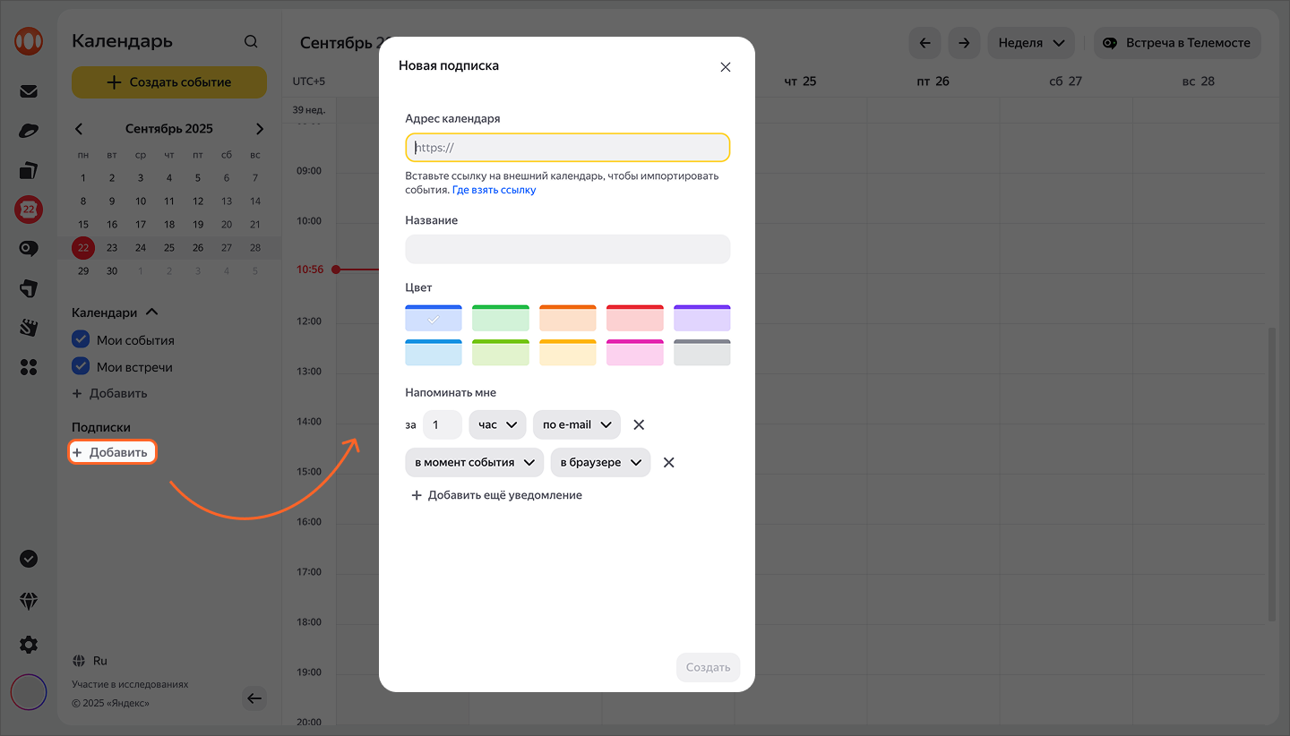 *.ics(iCal). - Напишите название календаря, выберите цвет событий, время и способ уведомлений.