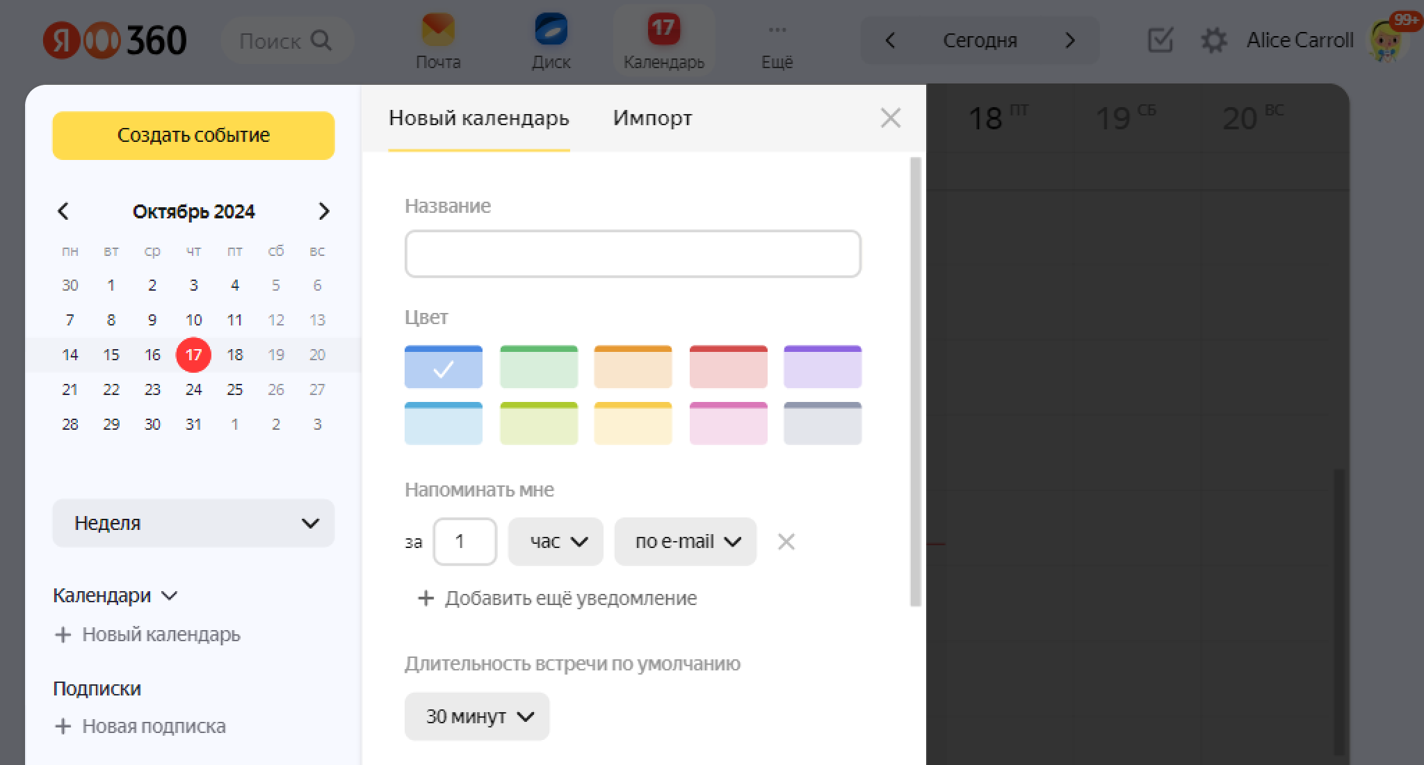 Taqvim nomini kiriting, tadbirlar rangi, vaqti va bildirishnoma usulini tanlang. Zarur holatda qo‘shimcha sozlamalarni, masalan, birlamchi majlis davomiyligi yoki ushbu taqvimdagi tadbirlarning qiyofasini ko‘rsating.