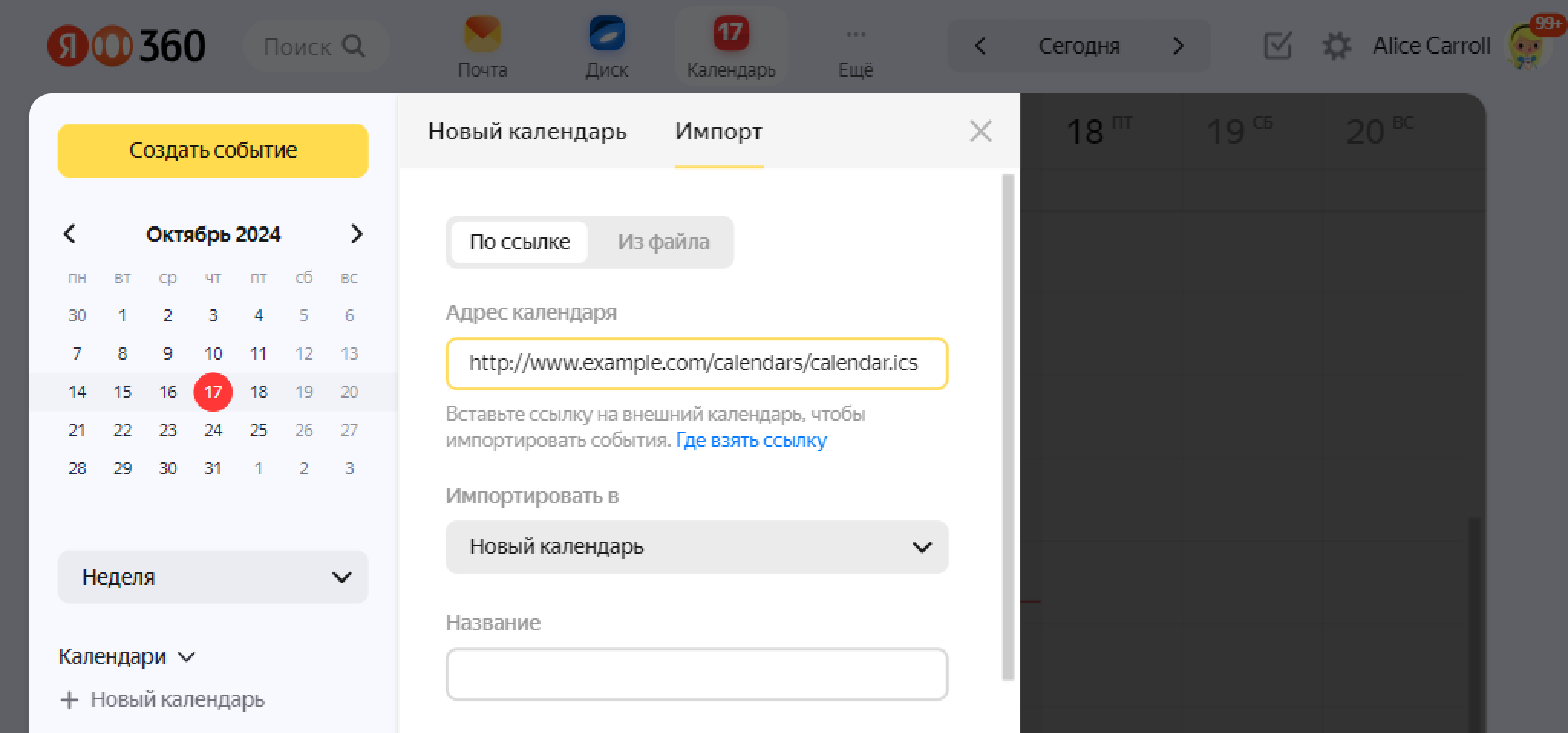 Boshqa xizmatdagi taqvimdagi tadbirlarni Yandex Taqvimga ko‘chirishingiz mumkin. Buni boshqa taqvimga havola yoki *.ics (iCal) formatidagi taqvim fayli yordamida amalga oshirish mumkin.