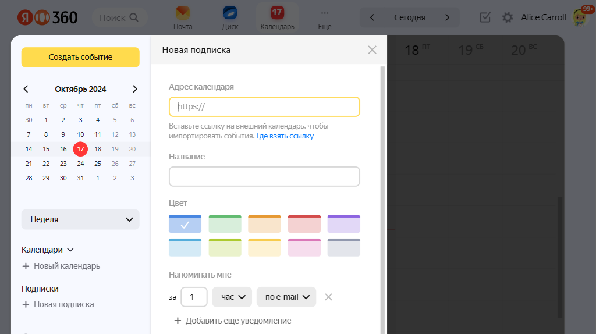 Boshqa manbada taqvimdagi o‘zgarishlarga obuna bo‘lishingiz mumkin. Yandex Taqvimda boshqa taqvimdagi barcha tadbirlarni ko‘rasiz, lekin ularni o‘zgartirish yoki yangisini yaratish imkonsiz.