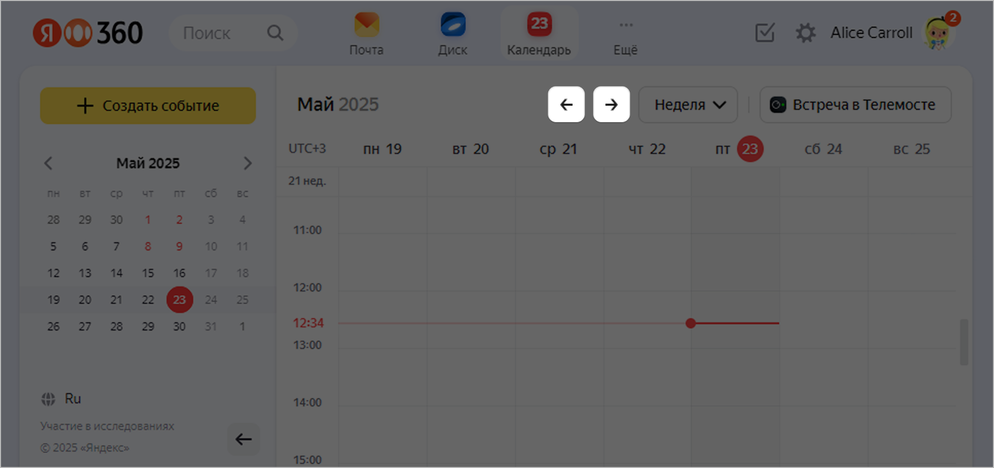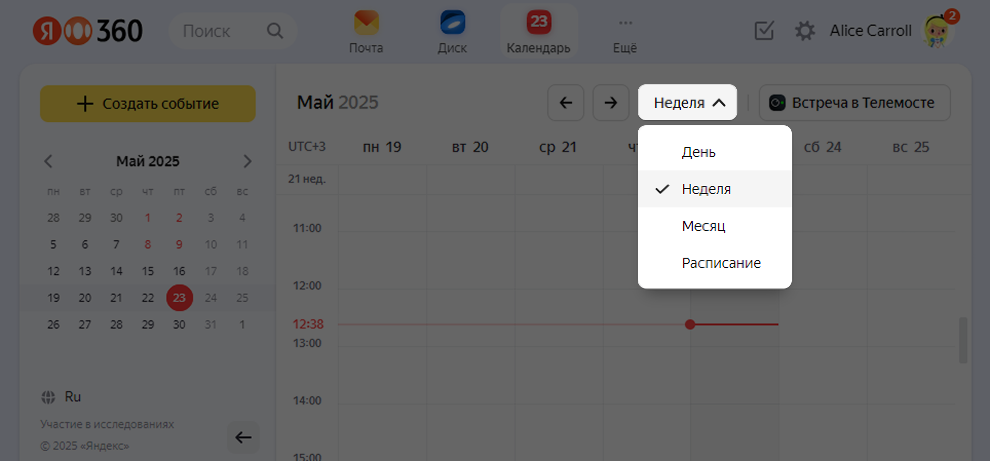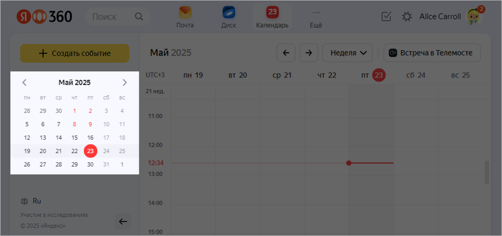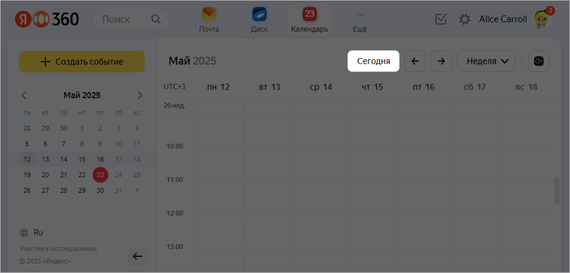 Agar Kun yoki Hafta rejimlarida barcha tadbirlarni ko‘rmasangiz, ular shunchaki ekranga sig‘maydi. Taqvim sahifasini sichqoncha g‘ildiragi bilan pastga yoki o‘ng tomondagi aylantirish chizig‘i yordamida varaqlang.