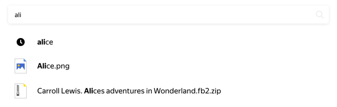 Kerakli faylni uning nomida pastki chiziq, defis yoki nuqta belgilari bo‘lsa ham uni topishingiz mumkin. Masalan, alice list so‘rovi bo‘yicha siz Alice_list.pdf, Alice-list.pdf, Alice.list.pdf fayllarini topasiz.