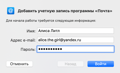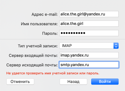 - Имя пользователя — ваш логин на Яндексе, например, «alice.the.girl» (часть адреса до знака