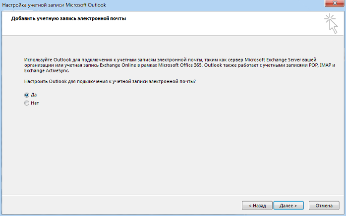 В окне Настройка учетной записи оставьте значение Да по умолчанию и нажмите Далее.