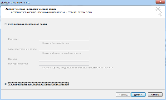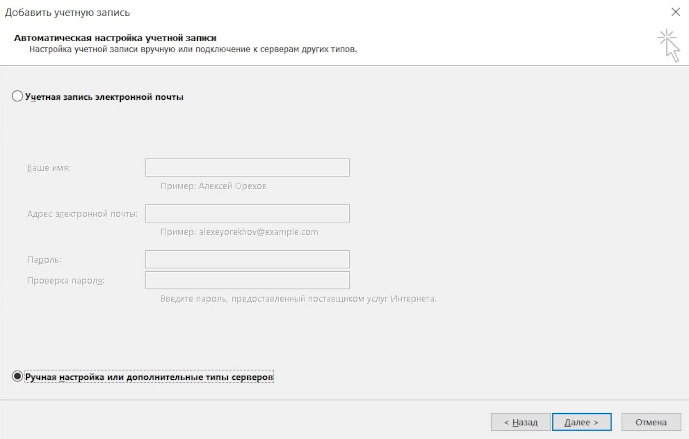 Выберите значение Ручная настройка или дополнительные типы серверов и нажмите Далее.