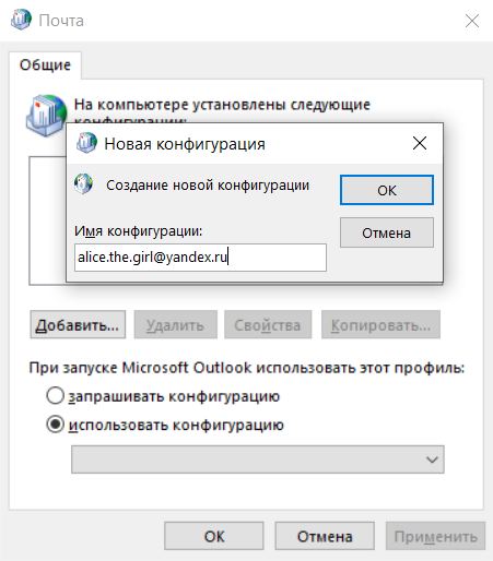 В открывшемся окне выберите один из аккаунтов или нажмите Добавить, чтобы создать новую конфигурацию.