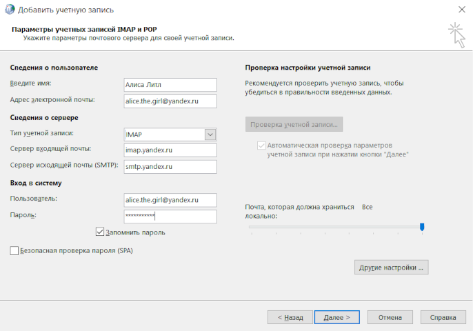 Чтобы завершить настройку учетной записи, в окне Добавить учетную запись нажмите Далее — будет выполнена проверка настроек учетной записи. Если проверка завершилась удачно, нажмите Готово. Если нет, убедитесь, что все параметры указаны корректно.
