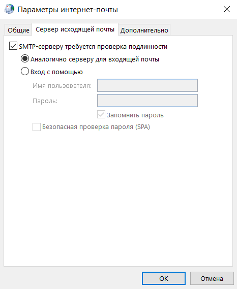 Перейдите на вкладку Сервер исходящей почты, включите опцию SMTP-серверу требуется проверка подлинности и выберите значение Аналогично серверу для входящей почты.