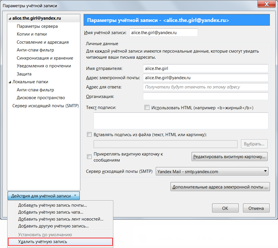 Нажмите на учетную запись правой кнопкой мыши (в списке папок) и выберите пункт Редактировать учетную запись.