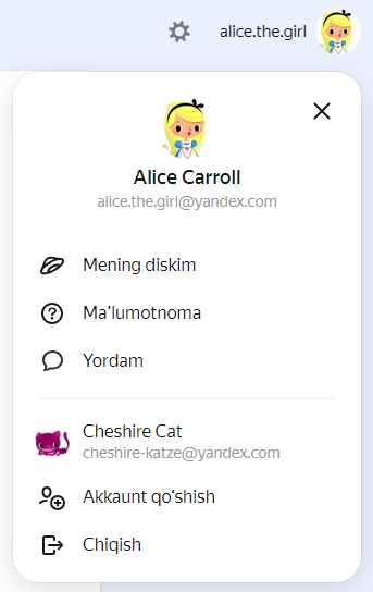 Siz ro‘yxatga 15 tagacha hisob kiritishingiz mumkin. Roʻyxatdan biror hisobni olib tashlash uchun unga oʻting va menyuda Yandex xizmatlaridan chiqish bandini bosing. Joriy hisob ro‘yxatdan o‘chiriladi va avtomatik ravishda ikkinchisiga o‘tasiz.