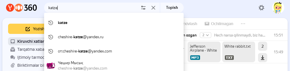 Yandex Pochta xatni agar siz so‘rovda ilova qilingan fayl nomini yoki biriktirilgan hujjat matnini ko‘rsatsangiz ham topadi.